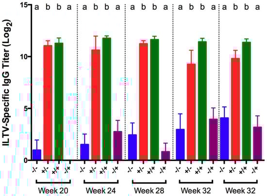 ILTV-specific IgG titers in serum collected 5 days post-challenge with ILTV strain 63140 for different groups of birds challenged at 20, 24, 28, 32, and 36 WOA. Letters (a–b) indicate significant differences among vaccine and challenge groups for each week (p < 0.05). −/− = non-vaccinated/non-challenged, +/− = vaccinated/non-challenged, +/+ = vaccinated/challenged, −/+ = non-vaccinated/challenged.