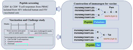 Antigen presentation is a complex process and essential for the protection conferred by the vaccine. To screen the target peptides, current study relied on recall responses from the HIV+ human PBMC and vaccinated feline PBMC. As mentioned earlier, the epitopes were screened for CD8+ T-cell proliferation and against pro-inflammatory cytokine production. The rationale behind the screening against the cytokine production was to avoid epitopes that could release cytokines that could lead to (i) increase in viral infection and (ii) cause more immunopathology. The selected peptides were palmitate or tagged with Tat sequence to increase cell-permeability for an efficient CD8+ T-cell responses (Figure 1).