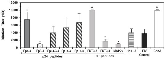 Direct effect of FIV peptides and MAP2v on in vitro FIV infection. The FIV peptides and MAP tested are FIV reverse transcriptase peptides FRT3-3, FRT3-4, and MAP2v (grey bar); FIV p24 peptides Fp9-3 (dotted bar); Fp14-3, Fp14-4, and overlapping Fp14-3/Fp14-4 (Fp14-3/4) (slanted line bar); and p24 peptide Fp4-3 (dark grey bar) as the positive control for peptide-induced enhancement. MAP2v contains the overlapping FRT3-3/FRT3-4 peptide. T-cell mitogen control (concanavalin A, ConA) (white bar) is used as a strong positive control for enhancement, whereas the HIV p24 peptide Hp11-3 (horizontal line bar) is included as a negative control. A peptide or MAP is considered to be enhancing or suppressing FIV infection when the average result post stimulation with the peptide or MAP is significantly higher or lower, respectively than the average result of the FIV virus control (black bar). Significant differences exists between the average result of the peptide- or MAP-stimulated triplicate cultures and those of the virus control cultures when the bar has (*) for p < 0.05 or (**) for p < 0.01. Although all peptides with corresponding MAPs were performed three-six times in smaller studies, the figure shows a typical result from one of the two studies with all of the peptides shown performed together. Each study is performed using PBMC from a different specific pathogen free (SPF) cat. MAP5 containing overlapping Fp10-2/Fp10-3 has been tested, but not shown.