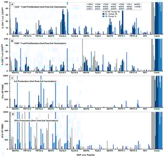 FIV MAP/peptide-specific T-cell proliferation and cytokine production of the PBMC from vaccinated cats at three weeks post-third vaccination. The results from CD4+ (A) and CD8+ (B) T-cell proliferation and the IL-2 (C) and IFNγ (D) production of the PBMC from the MAP-vaccinated cats are shown in response to the in vitro stimulation with MAP or FIV peptide. The vaccinated cats in Group 1a received concurrent subcutaneous plus intradermal (SC/ID) vaccinations with triple-MAP vaccine (grey bars), while those in Groups 1b and 1c received either subcutaneous (SC) (dark blue bars) or intradermal (ID) (blue bars) vaccinations with quadruplicate-MAP vaccine, respectively. The identification codes of each vaccinated cat are shown in the top right inset of panel A. Each bar represents the average response from a single vaccinated cat after subtraction of the average value of the results from eight control cats, with the exception of the mitogen control. Only bars at ≥0.5% CFSElow threshold for CD4+ and CD8+ T-cell proliferation or at ≥50 SFU/106 PBMC threshold for IL-2 and IFNγ production are shown.