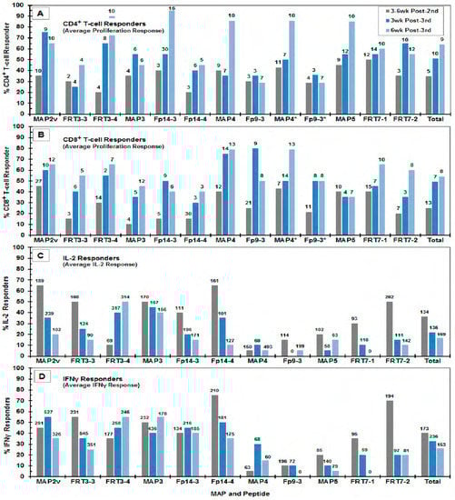 Contrary to the T-cell proliferation, the number of IL-2 and IFNγ responders had a decreasing trend with exceptions of IL-2 responses to FRT3-4, Fp9-3, MAP4, and MAP5, and the IFNγ responses to FRT3-4, Fp14-3, and MAP3 (Figure S1C,D, Figure 3C,D, Figure S2C,D; summarized Figure 4C,D). Sixty-four percent (7/11 MAP/peptide stimulants) of the IFNγ responses increased in magnitude between post-second vaccination and three weeks post-third vaccination, but by six weeks post-third vaccination the magnitude of all IFNγ responses decreased (Figure 4D). In contrast, the average magnitude of the IL-2 responses had an increase in 45% (5/11) of the peptide/MAP stimulations between post-second vaccination and six weeks post-third vaccination and 45% (5/11 stimulants) between three and six weeks post-third vaccinations (Figure 4C). The decreasing number of IL-2 and IFNγ responders and the increasing trend of the responders to CD4+ and CD8+ T-cell proliferation are also depicted in the average of the total responses (Figure 4, above “Total”).