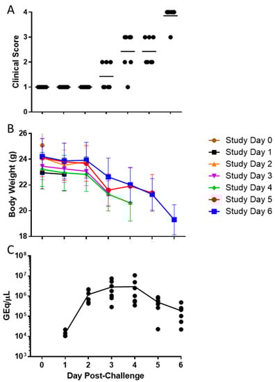3.3. Progression of Ebola Virus Disease in the IFNAGR Mouse Model