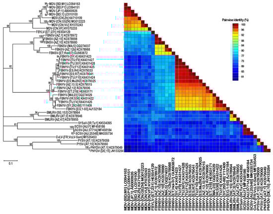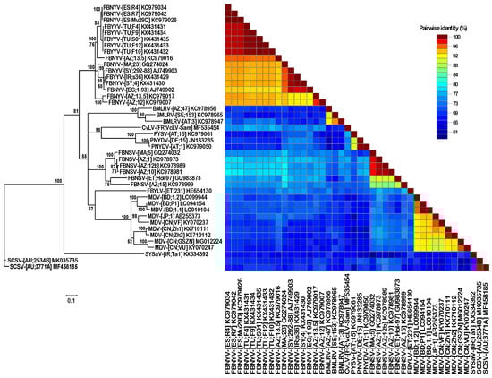 Maximum likelihood tree of nanovirus genome sequences. Individual genomic DNAs of faba bean necrotic yellows virus (FBNYV), milk vetch dwarf virus (MDV), faba bean necrotic stunt virus (FBNSV), faba bean yellow leaf virus (FBYLV), black medic leaf roll virus (BLMRV), cow vetch latent virus (CvLV), pea yellow stunt virus (PYSV), pea necrotic yellow dwarf virus (PNYDV), Sophora yellows associated virus (SYSaV), and subterranean clover stunt virus (SCSV) were concatenated in the order DNA-R, -S, -C, -M, -N, -U1, -U2, -U4 and aligned by MUSCLE. The tree was constructed in MEGA7 using the GTR+G+I nucleotide substitution model and is midpoint rooted. Branch support is shown as per cent bootstrap values. The scale bar represents 0.1 substitutions per site. On the right, a color-coded Sequence Demarcation Tool (SDT) matrix shows per cent pairwise sequence identities.