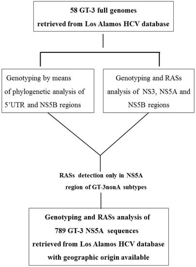 Next, in the same isolates, we compared the concordance of GT-3 subtypes identified in a phylogenetic analysis of a 5′untraslated (UTR) region, a partial NS5B region (which is commonly used in routine laboratory testing for genotyping), and the DAA target regions of NS3, NS5A, and NS5B. Among these 58 isolates, no RASs were found in the NS3 or NS5B domains, but 11/58 (19%) isolates harbored the A30K RAS and clustered with GT-3nonA. Therefore, we decided to extend the analysis to NS5A sequences deposited before 2010 into the Los Alamos HCV database [14]. We selected sequences derived from patients infected with HCV GT-3 that were naive to NS5A inhibitor treatments and had geographic origin data available. The study design is summarized in Figure 2. The accession numbers of the sequences included in the analysis are summarized in Tables S1 and S2. Amino acid changes were considered polymorphic or non-polymorphic, when present in at least 10% or <10% of sequences, respectively.