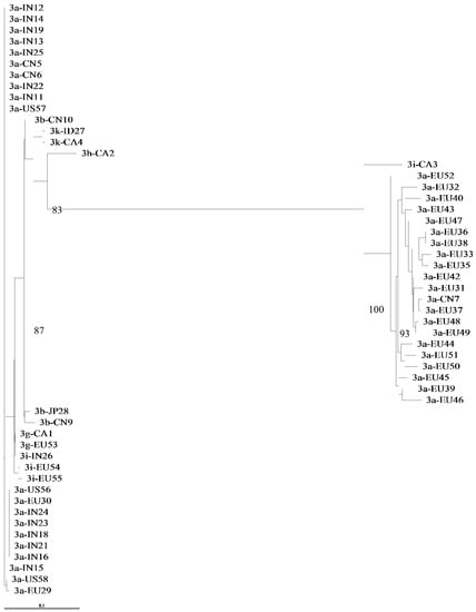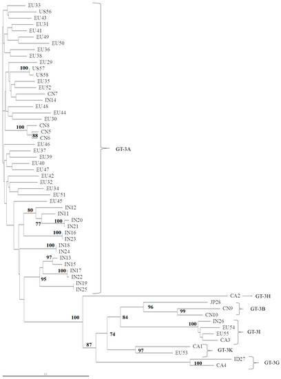 3.1. Concordance of GT-3 Subtypes Resulting from Phylogenetic Analysis of Different Regions (5′UTR, NS3, NS5A, and NS5B) in 58 Isolates Obtained from Los Alamos HCV Database