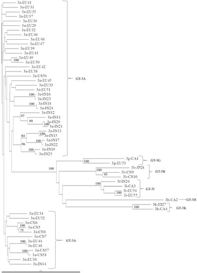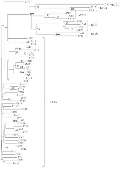 Phylogenetic tree of the 5′UTR region of 53 complete genomes retrieved from Los Alamos database. The maximum-likelihood phylogenetic rooted tree shows the relationships between different GT-3 subtypes of 53 isolates that had 5′UTR sequences available for analysis. Evolutionary distances are indicated next to the branches. Two isolates (CA2, CA3) clustered with GT-3A, but were identified as GT-3I and GT-3H subtypes, respectively, in a NS3, NS5A and NS5B phylogenetic analysis.