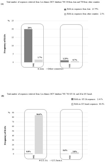 Currently, little information is available on the geographic distribution of RASs, according to GT-3 subtype. For example, it is well known that RAS Y93H is naturally present in GT-3A, but no data are available on the frequency of this RAS in other GT-3 subtypes. One report from China [7] showed that A30K was present in 14/48 GT-3 natural sequences. Hernandez et al. [8] derived 96 sequences from patients infected with GT-3 that were treatment-naive. Those patients were from North America, Europe and Australia. The predominant variant was NS5A A30 (85/96 sequences, 89%), but the A30K variant was detected in 6/96 sequences (6.3%) and A30L variants existed at lower frequencies (two sequences). They also found the Y93H at a frequency of 8.3% (8/96 sequences). However, those two studies did not detail the frequencies of RASs, according to the GT-3 subtype.