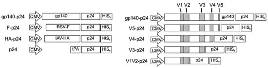 Initially, the expression plasmids Hgpsyn [30] and pConBgp140GC/D [31] carrying codon-optimized sequences for HIV Gag/pol or HIV Env, respectively, were used for DNA immunizations. Plasmids encoding the codon-optimized sequences of RSV-F or IAV-HA have been described previously [32]. For the direct comparison, new expression plasmids were generated based on the pVax vector and each encoded a fusion construct of the soluble ectodomain of the respective viral surface protein and HIV p24 as an internal control antigen. The ectodomains of HIV-Env, RSV-F, and IAV-HA were amplified without the transmembrane and intracytoplasmic domain by specific PCRs and cloned separated by a G4S linker at the N-terminal position of HIV p24 into pV-mDEC-HIVp24 [33]. The resulting plasmids are referred to as gp140-p24, F-p24 and HA-p24 respectively and lead to the expression of secreted fusion proteins. Since p24 alone is not secreted, an additional control plasmid, referred to as p24, was used in the immunization which mediates the secretion of a non-fused p24 by a TPA leader signal. Further Env–p24 fusion constructs were generated in which the gp140 was stepwise shortened by cutting after the respective variable region. All expression cassettes contain a CMV promotor and an additional HIS6-Tag at the N-terminus for purification purposes. A schematic overview on the ORFs of the new constructs is shown below in Figure 1.