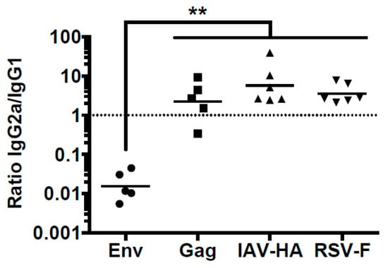 Differential humoral immune responses after DNA immunizations. Balb/c mice were immunized with either a combination of Env- and Gag-encoding plasmids (Hgpsyn and pConBgp140GC/D), or with RSV-F- or IAV-HA-encoding plasmids. Two weeks after the second immunization, antigen-specific IgG1 and IgG2a were determined via ELISA for each antigen separately and IgG2a/IgG1 ratios were calculated. Each Symbol represents an individual animal and geometric means are indicated by the solid lines. (n = 5–6, ** p < 0.01; Kruskal-Wallis with Dunn’s post-test).