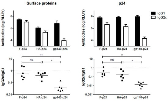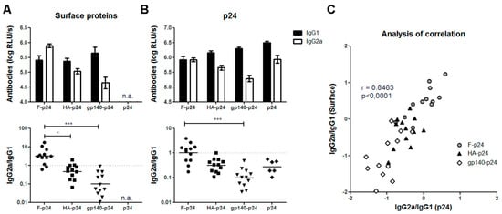 Antibody responses induced by DNA vaccines encoding p24 fusion proteins. Balb/c mice were immunized twice with the plasmids F-p24, HA-p24, gp140-p24, and p24, encoding fusions proteins as depicted in Figure 1. Two weeks after the booster immunization, the antibody levels specific for the respective surface proteins (A) or for the p24 antigen common to all fusion proteins (B) were determined by antigen-specific ELISAs (serum dilution 1/10,000). The RLUs for both IgG1 and IgG2a are depicted as mean values with SEM for the vaccine groups (top) and the ratio of RLUs for IgG2a to IgG1 were calculated for each mouse individually (bottom). The bars show the geometrical mean values (n = 6; * p < 0.05, ** p < 0.01, *** p < 0.001, Kruskal-Wallis-test with Dunn’s post-test). (C) Linear regression analysis (Pearson) between the IgG2a/IgG1-ratios to the surface protein and the fused p24.