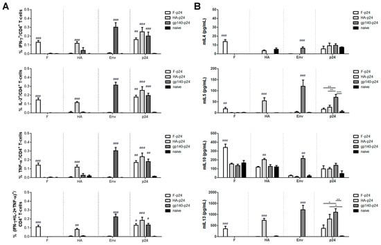 To determine the cellular immune response, six weeks after the initial immunization the spleens were collected in 5 mL HBSS (Life Technologies) and single-cell suspensions were prepared using a 70 µm cell strainer. After red blood cell lysis, splenocytes were resuspended at a cell density of 107/mL in RPMI 1640 (Life Technologies) supplemented with 10% FCS (Life Technologies), 1% penicillin/streptomycin (Life Technologies), 10 mM HEPES, 4 mM L-glutamine (Life Technologies), and 50 µM 2-mercaptoethanol. Intracellular cytokine staining was performed as previously described [13]. Briefly, 106 splenocytes/well were seeded in a 96-well U bottom plate and stimulated with 5 µM of MHC-II restricted peptides (RSV-F: GWYTSVITIELSNIKE; IAV-HA: SFERFEIFPKE; HIV-Env: GVPVWKEATTTLFCASDAKA; HIV-Gag: PVGEIYKRWIILGLN and SPEVIPMFSALSEGA) in the presence of monensin (2 µM) and 1 µg/mL of an anti-CD28-antibody (BD Bioscience).