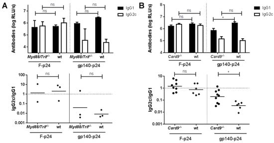 Impact of TLR- or CLR-signaling on the antibody response. Myd88/Trif−/− (A) or Card9−/− (B) mice were immunized with either F-p24 or gp140-p24 as described above and compared to WT C57Bl/6J mice. The levels of IgG1- and IgG2c specific for RSV-F or HIV-Env were determined by ELISA at a serum dilution of 1:1000 for both knock-out strains. Again, the IgG2c/IgG1 ratios were calculated for the individual animals represented by the symbols (n = 2–3 for Myd88/Trif−/−; n = 6–9 for Card9−/−). The bars represent the mean values with SEM (top), whereas the lines represent the geometrical mean for each vaccine group (bottom) (* p < 0.05, ns = not significant, Student’s t-test).