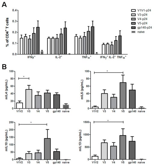 Cellular immune responses to the truncated variants of Env. Balb/c mice were vaccinated twice with the plasmids encoding the truncated Env-variants V1V2, V3, V4, V5, and the parental gp140 construct. Env-specific CD4+ T-cell responses were analyzed two weeks after the immunization. Intracellular cytokine staining was used for the detection of the typical TH1 cytokines and the percentages of IFN-γ, TNF-α and IL-2 producing CD4+ T-cells as well as polyfunctional triple positive cells are depicted in (A). In contrast, the analysis of TH2 cytokines was performed by a cytokine specific ELISA (B). In each graph, the bars represent the mean values with SEM of 4–6 mice (* p < 0.05, one-way ANOVA with Tukey’s post-test).