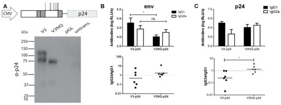 Impact of the glycosylation of the C2V3 region on the humoral immune response. (A) To delete all potential N-glycosylation sites from the C2V3 region, the Asn-coding triplets (indicated by arrows) in the construct V3-p24 were mutated to Gln-coding ones. 293T cells were transfected with the new construct, V3NQ, and deglycosylation of the Env variant was confirmed by Western Blot analyses of the supernatants with an p24-specific antibody. (V3 = glycosylated, V3NQ = not glycosylated, pGL = transfection control, untrans. = untransfected). Balb/c mice were immunized as described above with either V3-p24 or V3NQ-p24 and the antibody responses to Env (B) and p24 (C) were analyzed two weeks post boost immunization. The upper part shows the level of IgG1- and IgG2a-antibodies as mean values with SEM for six animals each (* p < 0.05, ns = not significant, Student’s t-test). The lower part depicts the ratio of IgG2a to IgG1 for each animal with bars indicating the geometrical mean values (* p < 0.05, ns = not significant, Mann-Whitney-test).