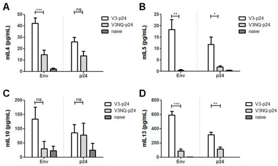 Impact of the glycosylation of the C2V3 region on TH2 responses. Balb/c mice were immunized twice in a 4-week interval with either V3-p24 or V3NQ-p24. Two weeks after the booster immunization, the cellular immune response to Env and p24 was analyzed via cytokine-specific ELISA. Depicted are the levels of the IL-4 (A), IL-5 (B), IL-10 (C) and IL-13 (D) as mean values with SEM (n = 4–6, * p < 0.05, ** p < 0.01, *** p < 0.001, ns = not significant, One-Way ANOVA with Tukey’s post-test).