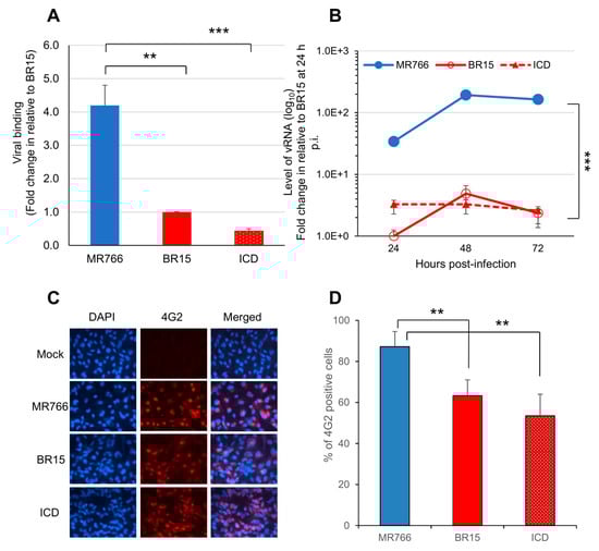 Viral infectivity is defined as the ability of the ZIKV to bind, enter, and to replicate in host cells over time []. The goal of this experiment was to compare the viral infectivity between the epidemic Brazilian ZIKV molecular clones (BR15 and ICD) and the historical African ZIKV molecular clone (MR766). We first compared the viral attachment between molecular clones derived from epidemic Brazilian ZIKV strains (BR15 and ICD) and from the historical African ZIKV strain (MR766). All three ZIKV molecular clones have been reported previously [,]. The historical MR766 ZIKV strain is the first documented Zika strain that was isolated from caged monkey in the Zika forest in Uganda in 1947 []. Two epidemic ZIKV strains, BR15 (BeH819015) and ICD (Paraiba_01/2015) were isolated from Brazil in 2015 during the ZIKV epidemic [,]. A human brain glial cell line SNB-19 was used in this study because it is highly permissive to ZIKV infection [].