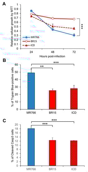 We next tested ZIKV-mediated cytotoxicity of the three ZIKV molecular clones. The SNB-19 cells were infected with the three molecular clones separately, as described in the Materials and Methods section. The MTT assay, which measures cell proliferation and viability [], was used to measure the impacts of ZIKV infection on cellular metabolic activities. As shown in Figure 2A, cell proliferation and viability decreased rather rapidly in the MR766-infected cells between 24 h to 72 h p.i., whereas BR15- and ICD-infected cells were less affected. Even though the trend was clear, the differences are not statistically significant. ZIKV-mediated cell death was then measured over the same period of time by Trypan blue staining that specifically detects dead cells. Time-dependent cell death was observed in cells infected with all three molecular clones. ZIKV-induced cell death was the most pronounced at 72 h p.i., in which the rate of MR766-induced cell death was significantly increased with 49.0 ± 5.0% of Trypan blue-positive cells than that of BR15 or ICD both with 25.3 ± 2.1%, and 27.9 ± 4.4% of dead cells, respectively (Figure 2B; two-tailed t-test). To further assess whether ZIKV-induced cell death in the SNB-19 cells was caused by apoptosis, we carried out an immunostaining assay to measure in situ Caspase-3 (Casp-3) cleavages, a hallmark of apoptosis [,]. In mock-infected cells, little or no cells showed background staining (Supplemental Figure S1A); whereas ZIKV-infected cells showed Casp-3 cleavages, and MR766-infected cells showed significantly higher percentage of apoptotic cells (Figure 2C; two-tailed t-test, p ≤ 0.001). These data show that the historical MR766 molecular clone is more apoptotic than the two Brazilian molecular clones (BR15 and ICD), suggesting that mutations within the epidemic strains might contribute to the reduced cytotoxicity.