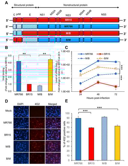 We next analyzed the percentages of SNB-19 cells infected with these two chimeric viruses and their parental controls. As shown in (Figure 3D,E), both chimeric viruses were able to infect the SNB-19 cells. Interestingly, an opposite correlation was observed between the chimeric viruses and the parental viruses in the percentages of viral infection to the SNB-19 cells. Statistical two-tailed and paired t-test analyses showed that the differences between MR766 vs. BR15, and MR766 vs. B/M were highly significant with p ≤ 0.01 (***) for both comparisons; whereas the difference between MR766 and M/B was not significant with p = 0.64. Thus, the levels of infected cells, with a given chimeric virus, correlated with the C-prM region of its parental virus, not the E region. Indeed, in the cells infected by the M/B chimeric virus, the percentage of infected cells was significantly higher than that of BR15, but it was comparable with that of MR766 (p = 0.64, two-tailed and paired t-test). A similar correlative relationship was also observed between the B/M chimeric virus and the BR15 virus (Figure 3E).