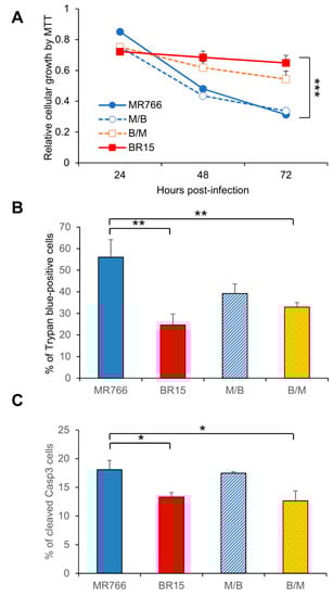 The data shown in Figure 3D,E were unexpected. It is believed that if the virus has high binding efficiency to the host cells, it should result in higher percentage of viral infected cells. Since ZIKV induces cytotoxicity, we reasoned that the C-prM region could contribute to ZIKV-induced cytotoxicity, which affects the outcome of the measured levels of viral infection. To test this possibility, we measured the effects of chimeric viruses on cell proliferation and viability. As shown in Figure 4A, genetic determinant(s) of cell viability was associated with of the C-prM region of the viral genome. For instance, both MR766 and M/B showed similar cell growth pattern, which was clearly distinguishable from that of BR15 and B/M. Nevertheless, a statistical t-test showed those differences were not statistically significant. However and consistent with the trend shown in Figure 4A, a similar but statistically significant correlation was detected in ZIKV-induced cell death (Figure 4B), and in apoptosis, as shown by the casp-3 cleavages (Figure 4C). Together, these data supported the idea that the C-prM domain of African ZIKV molecular clone contributes to ZIKV-induced growth restriction and apoptotic cell death.