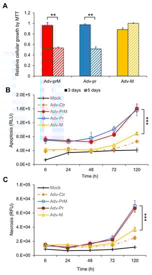 Effect of prM protein processing on ZIKV-induced neurocytotoxicity. (A) Cell proliferation and viability was measured overtime by the MTT assay. The graph is plotted as the relative growth in relevance to mock infected SNB-19 cells. The differences shown were highly significant with p < 0.05 (**). (B) Measurement of apoptosis by Annexin V over time. The difference between Adv-prM and Adv-M was highly significant with p < 0.01 (***), but the difference between Adv-prM and Adv-Pr was not significant with p = 0.84. (C) Measurement of cellular necrosis over time. Two-way ANOVA was used to calculate the difference between Adv-prM and Adv-M for (B) and (C). The differences between Adv-prM and Adv-M were highly significant with p < 0.01 (***). More than two different experiments were conducted to evaluate apoptosis and necrosis. All results represent average and standard deviation (X ± SD).