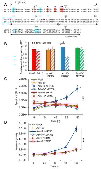 In Figure 2, we showed that the MR766 was more cytotoxic than the BR15. Our data further showed that the MR766 prM, and its cleaved product, Pr protein contributed to ZIKV-induced cytotoxicity, suggesting that the Pr region of the prM protein might be the source of prM-mediated cytotoxicity (Figure 5). However, we did not know whether Pr-induced apoptosis is ZIKV strain-specific. There is a total of 10 known divergent a.a. mutations of prM protein between MR766 and BR15 (Figure 6A) []. Seven of those mutations are within the Pr region. Thus, we tested whether the Pr-induced cell death is only restricted to MR766, or whether we could alter the Pr-induced cell death by introducing divergent genetic mutations, that are present in the Pr protein of the BR15 molecular clone into the MR766 Pr protein. The residue 139 was first selected for reverse genetic analysis because the pre-epidemic to epidemic mutational transition from S to N at the residue 139 (S139N) of the Pr region was reported to be a crucial site for ZIKV-induced microcephaly []. Here, we reversed this mutational transition by generating the N139S mutation on the backbone of the BR15 Pr nucleotide sequence (Adv-PrBR15) to generate the Pr mutant (Adv-Pr†BR15). Another four additional a.a. mutational sites (A148P, V153M, H157Y and V158I) were selected for the forward genetic mutagenesis. This region was of particular interest because the A148P mutation could have a major impact on protein folding. We decided to replace the entire cluster 148->158 as adjacent mutations could support putative structure changes associated with A148P mutation. The wildtype MR766 Pr nucleotide sequence (Adv-PrMR766) was used to generate the MR766 Pr mutant clone (Adv-Pr*MR766), that carries the four selected mutants to represent forward genetic mutations.