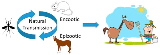 Venezuelan equine encephalitis virus (VEEV) transmission. VEEV is transmitted by a variety of mosquitoes. Enzootic strains are maintained in a cycle between small rodents and mosquitoes. Epizootic strains are transmitted by mosquitoes to equines, causing high titer viremia and high mortality. The virus is tangentially transmitted by mosquitoes from equines to humans that work in close contact with equines.