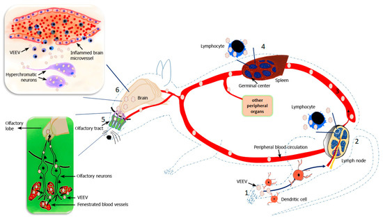 Biphasic replication of VEEV in mice. Mice infected via VEEV footpad injection mimics the natural mode of transmission by mosquito bites (1). After initial inoculation, regional dendritic cells take up the virus and transport it to the local draining lymph nodes, where VEEV replicates in lymphocytes (2) and is then released into the circulation resulting in viremia (3). VEEV replicates in various tissues, but lymphoid organs such as the spleen are primary replication sites (4). Around 24–36 h post infection, VEEV escapes into the olfactory tract infecting olfactory nerve endings initiating the first step of CNS phase of infection (5). Virus moves through the axons of the olfactory neurons and enters the olfactory lobe of the brain (large insert). In the brain, VEEV primarily infects the neurons, but glia and oligodendrocytes are also targets of VEEV infection. VEEV induced inflammation causes vascular cuffing and alteration in the BBB allowing mononuclear lymphocytes to enter the brain (6). VEEV mediated alteration of the BBB may allow the virus to enter the brain, but this route of entry is debated.