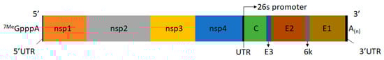 Organization of VEEV genome. VEEV genome is a single-stranded positive-sense RNA of 11.4kb length. VEEV encodes four nonstructural proteins (nsP1, nsP2, nsP3 and nsP4) and five structural proteins (capsid (C), envelope (E) 3, E2, 6k, and E1). VEEV genome has mRNA characteristics. 5’ untranslated region (UTR) is capped with methyl residue present on the 7-position of capping guanosine nucleotide. A short UTR is present after the nsp4 gene sequence that has a promoter sequence for a 26S subgenomic RNA. There are two open reading frames (ORF) in the genome. The first ORF in the 5’ region translate nonstructural proteins and the second ORF in sub genomic RNA translate structural proteins. 3’ end of the genome has a poly(A) tail.