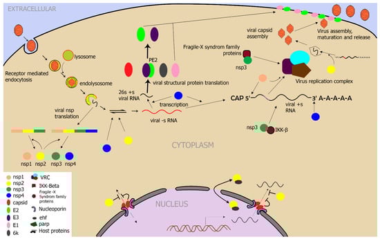Replication of VEEV in host cell. VEEV enters in the host cells by receptor mediated binding of the virus to the host cell membrane. Virus containing endosomes fuse with lysosomes resulting in formation of endolysosomes. Viral RNA is released in the cytoplasm following pH dependent conformational changes in the viral proteins, allowing fusion with the endolysosome membrane. VEEV is a single-stranded positive-sense RNA virus that replicates in the cytoplasm and does not have a nuclear phase of replication. In the second phase of infection, viral nsp are translated as P123 and P1234 polyproteins from the viral genomic RNA. Autolytic activity of nsp-2 cleaves the viral polyproteins in individual nsp-1, nsp-2, nsp-3, and nsp-4 proteins. Nsp-4 is a viral RdRp, which with methyltransferase activity of nsp-2, drives synthesis of negative-sense viral RNA. Negative-sense viral RNA is transcribed into smaller 26S subgenomic positive-sense RNA and a full-length positive-sense viral RNA. Subgenomic 26S RNA is translated into viral structural proteins namely capsid, a polyprotein of E3 and E2 called PE2, 6k, and E1. PE2 is processed into E3 and E2 proteins by cutting at the furin-cleavage site in PE2. Viral nsp-2 plays a role in capping of viral genomic RNA via its methyltransferase and guanylylation activity. Nsp-4 adds a poly-A tail to the viral genomic RNA via its terminal adenyltransferase activity. Full length positive- sense viral RNA is incorporated into a virus replication complex (VRC). Assembly of VRC is aided by interaction of viral non-structural proteins with host proteins such as nsp-3 with IKK-β and Fragile- X syndrome family proteins. Nsp-3 binds to other unknown host proteins during formation of VRC, the role of which is not yet understood. Nsp-1 conserved sequence element helps in the recognition of the core promoter element of the virus genome by VRC. In addition to direct involvement of viral proteins in replication and assembly, viral non-structural proteins interact with host factors to promote VEEV replication. Capsid proteins bind to components of the nuclear pore complex effectively blocking nuclear-cytoplasm-nuclear traffic and host protein translation. Nsp-2 interacts with karyopherin-alpha 1 for its nuclear localization function, role of which is not clearly understood. Nsp2 plays a role in loading of the viral RNA into nucleocapsid and maturation of virions. In the final step structural proteins E1 and E2 are embedded in the plasma membrane, and assembly and release of the mature virion particle occurs by encapsulating nucleocapsid and budding at plasma membrane [2].