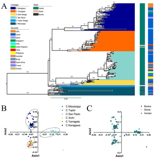 (A) ML phylogenetic tree of the ICV HE gene reconstructed in RAxML (_v8.2.10) using the GTR + GAMMA + I model and supported by 1000 bootstraps. The observed six individual lineages: C/Kanagawa, C/Yamagata, C/Aichi, C/Sao Paulo, C/Taylor, and C/Mississippi lineages are represented in dark blue, orange, light green, yellow, light blue and cyan, respectively. Coloured boxes along the right of the tree represent the hosts and countries of isolation. The host species coloured in dark green, light brown, and dark grey represent human, swine, and bovine, respectively. The individual countries are indicated with different colours. The no-coloured regions denote no related information recoded in NCBI. PCA analysis explained with the first two axes. (B) PCA according to the six evolutionary lineages (colours codes same as A). (C) PCA according to the isolated host species (colours same as A).