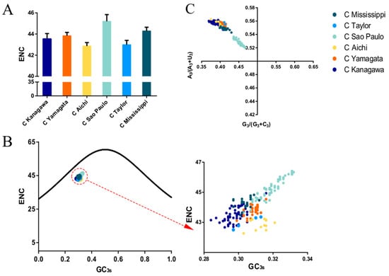 The ENC was calculated using the CodonW software. The ENC values range from 20 (an extreme codon usage bias when only one synonymous codon is used) to 61 (no bias when all the synonymous codons are used equally for the corresponding amino acid) []. The ENC values were calculated as follows: