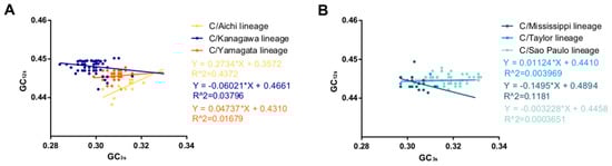 Neutrality analysis of the ICV HE gene. GC3s are plotted against GC12s. (A) C/Aichi lineage, C/Kanagawa lineage, and C/Yamagata lineage. (B) C/Mississippi lineage, C/Taylor lineage, and C/Sao Paulo lineage.