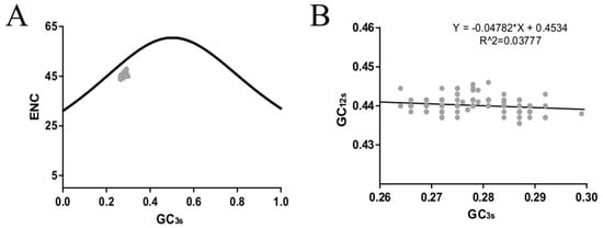 ENC plots are generally used to visualize whether mutation pressure plays a vital role in codon usage bias or not. The plot is constructed by graphing GC3s in the abscissa and ENC in the ordinate. If a point lies on or around the standard curve, it means that the codon usage bias is merely constrained by mutation pressure. Otherwise, other factors may also play a vital role, such as natural selection []. The calculations of the expected ENC values for each GC3s were estimated as follows: