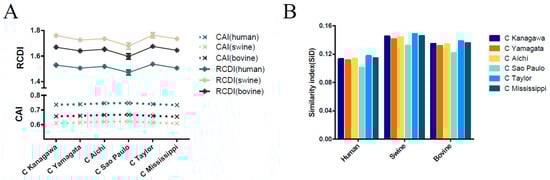CAI analysis was performed to determine the gene expression levels in specific hosts. We calculated the CAI values of the six phylogenetic lineages based on the three currently identified hosts. Mean CAI values of 0.74 ± 0.0056, 0.61 ± 0.0059, and 0.66 ± 0.0056 were estimated for the overall HE gene in relation to H. sapiens, Sus scrofa, and Bos Taurus, respectively. The highest CAI value was for H. sapiens and the lowest for Sus scrofa. The C/Sao Paulo lineage had the highest CAI value (0.7469 ± 0.0028 for H. sapiens, 0.6212 ± 0.0030 for Sus scrofa, 0.6674 ± 0.0027 for Bos Taurus) compared to the other five lineages (Figure 5A). RCDI values were calculated to compare the similarity in the codon usage of the HE gene and hosts. The mean of the RCDI values was highest for Sus scrofa (1.72 ± 0.038), followed by Bos Taurus (1.64 ± 0.034) and H. sapiens (1.50 ± 0.028), indicating the highest codon usage deoptimization for Sus scrofa. In terms of lineages, the C/Kanagawa and C/Sao Paulo lineages showed the highest and the lowest RCDI values in relation to the hosts (excluding the C/Taylor lineage for its limited number of sequence), respectively (Figure 5A). Moreover, the results among different ICV lineages or hosts were significant, with a p cut off < 0.001, in relation to both CAI and RCDI. For the M gene, the lowest CAI value and the highest RCDI value were observed in swine, similar to the HE gene (Figure 6A).