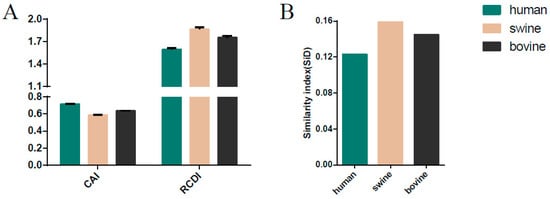 The codon adaption index (CAI), the relative codon deoptimization index (RCDI) (A), and similarity index (SiD) analysis of the ICV M gene in relation to the host species. Dark green, pink, and black indicate human, swine, and bovine, respectively.