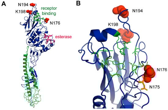 Residue 176 is located in a loop below the receptor-binding site. It contains asparagine in the HE of most isolates, but sometimes changes to an aspartate, for example, in the Miyagi clade of human ICV. Residue 176 is adjacent to the N-glycosylation site asparagine 175 (shown as an orange stick in Figure 7B). There is experimental evidence showing that this site is used, at least in the AA/50 strain that contains an asparagine at position 176 []. Residue 176 is part of the N-glycosylation motif (asparagine, any amino acid, serine, or threonine), in that case asparagine 175, asparagine 176, and serine 177. Since every amino acid (except a proline) is accepted by the oligosaccharyltransferase at that position, it seems unlikely that the mutation from asparagine to aspartate prevents the attachment of a carbohydrate to asparagine 175.