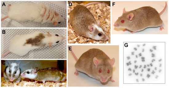 The multimammate mouse Mastomys coucha. (A–D) Black-eyed Mastomys coucha with different coat colors. (E,F) Chamois-colored red-eyed Mastomys coucha used at the DKFZ (derived from the GRA-Giessen strain). (G) Metaphase chromosome spread obtained from a Mastomys coucha splenocyte (2n = 36; 630× magnification).
