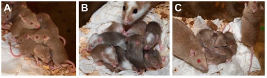 Young Mastomys coucha. (A) Young Mastomys usually huddle together. (B,C) Parental Mastomys, especially the mother, have a strong protective instinct and always stay close to their offspring.
