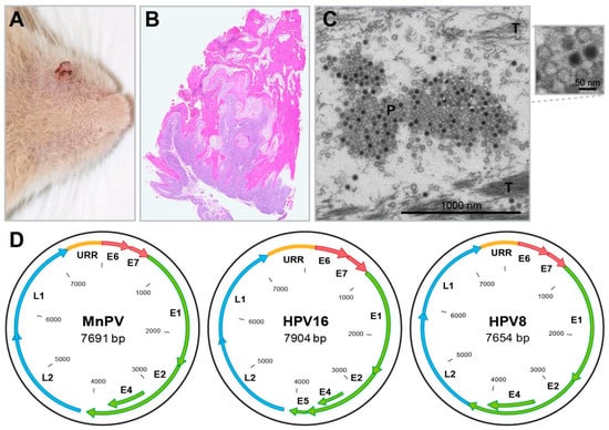 Viral particles can be found in large amounts in nuclei of tumor cells and keratinized masses of skin tumors [110], as well as upper parts of the stratum granulosum and stratum corneum [113] (Figure 4C). They were structurally characterized as a typical papillomavirus of 52 nm in size, referred to as Mastomys natalensis papillomavirus (MnPV) [112]. The sequence of the MnPV genome contains open reading frames for the early genes E6, E7, E1, E2 and E4, the late genes L1 and L2, as well as an untranslated URR (upstream regulatory region) (Figure 4D) [114]. The E5 gene, known from mucosal alpha-type human papillomaviruses (HPVs), is missing—a feature shared with cutaneous beta-type HPVs [115]. These, like HPV5 or HPV8, cause epithelial lesions or tumors especially in organ transplant recipients [116,117], but also in immunocompetent individuals [118].