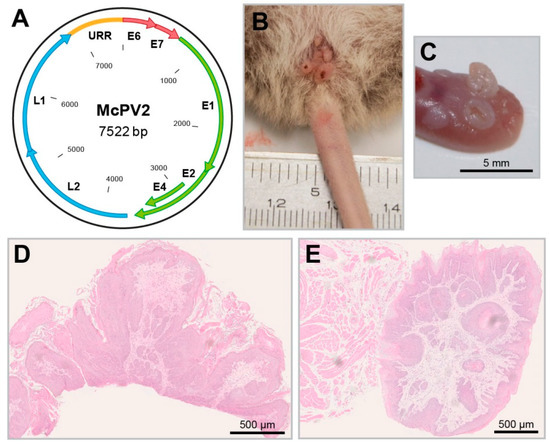 Moreover, improved detection methods also identified a new papillomavirus (McPV2) (Figure 5A), which is phylogenetically distant from MnPV and mainly found in anogenital lesions (Figure 5B,D), but also in other organs and mucosal tissues, such as the oral cavity or the tongue (Figure 5C,E) [138]. In that way, Mastomys coucha is the only model where the biology of both a cutaneous (MnPV) and mucosal papillomavirus (McPV2) can be investigated in the same animal. Here, as measured with glutathione S-transferase (GST)-capture ELISAs, the seroreactivity against the L1 capsid proteins of both viruses was found to be significantly increased in animals bearing the respective skin or anogenital lesions [139].