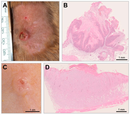 Apparently, the so-called KAs observed in Mastomys (Figure 4B) differed from KAs known from humans regarding histology and time course. While, macroscopically, a strong keratinization and infiltration to surrounding tissue were similar, human KAs were described as emerging from hair follicles [119], while those in Mastomys seemed to arise from the surface and at best at the infundibulum of the hair follicle [109]. However, considering later data obtained by in-situ hybridization, MnPV as the etiological agent for papillomas, KAs and SCCs could be also detected in hair follicle cells, being apparently a reservoir for these viruses [105]. Up to date, a spontaneous regression described for human KAs was never reported for Mastomys where the tumor continues growing and infiltrating even down to the muscle tissue [110].