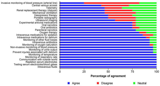 Figure 3 illustrates to what extent respondents believed individual interventions listed in the survey tool should become standards of ETU care. No respondent disagreed with statements proposing that the following 12 interventions should be systematically available to all patients treated in ETUs: (1) intravenous fluids (n agree = 28), (2) testing of serum biochemistry (n agree = 28), (3) correction of biochemical anomalies (n agree = 28), (4) methods to enable communication with relatives and friends (n agree = 28), (5) non-invasive monitoring of respiratory rate (n agree = 28); (6) temperature (n agree = 28) and (7) blood pressure (n agree = 27; n neutral = 1), (8) monitoring of urine output (n = 27), (9) early recognition of clinical deterioration and the prevention of injuries (n agree = 27; n neutral = 1), (10) intravenous antibiotics (n agree = 26; n neutral = 2), (11) monitoring of gastrointestinal fluid losses (n agree = 26; n neutral = 2), and (12) intravenous opioids for treatment of pain (n agree = 22; n neutral = 6).