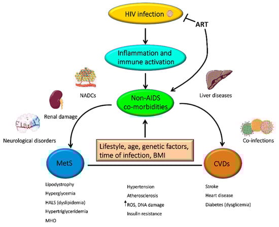 The successful introduction of ART increased the life expectancy of PLWH and consequently their risk of developing non-AIDS co-morbidities, such as MetS and CVDs [78] (Figure 2).