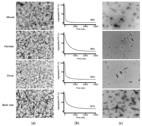 - Jones, E.M.; Surewicz, W.K. Fibril conformation as the basis of species- and strain-dependent seeding specificity of mammalian prion amyloids. Cell 2005, 121, 63–72. [Google Scholar] [CrossRef] [PubMed]