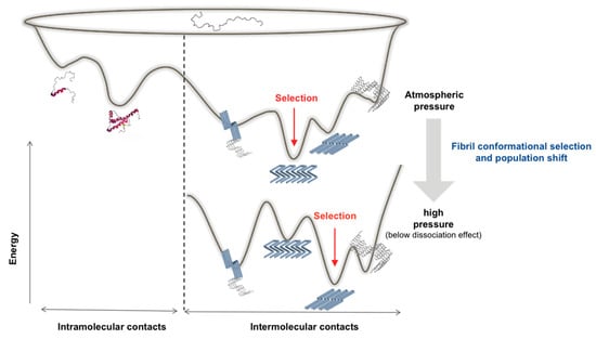 Schematic representation of a hypothetical effect of pressure on the energy landscape of an amyloidogenic protein. The conformational selection phenomenon assumes that the new thermodynamic condition reached under pressure will preferentially stabilize the amyloid state (i.e., conformation) with the highest packing density, resulting in a population shift of the ensemble toward the state showing the deepest energy minimum.