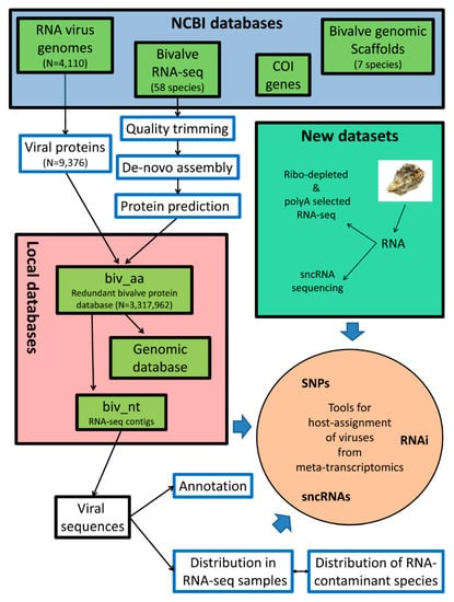 Summary of the analysis pipeline. The graph summarizes all of the steps that were used to extract viral sequences from bivalve RNA-seq datasets. Additional details are reported in corresponding sections of Materials and Methods.