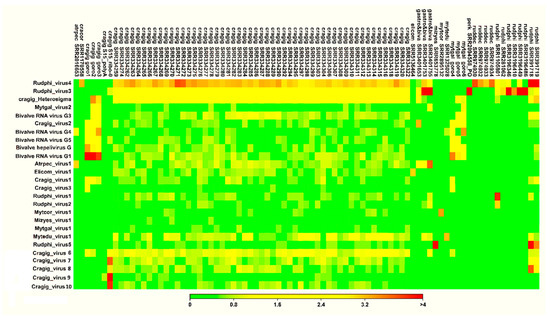 Coverage heat map for the 26 bivalve-associated viruses over 82 RNA-seq samples with at least 1000 viral reads. Data are reported as log10, as depicted in the colored scale. Raw data are reported in Supplementary Table S3.