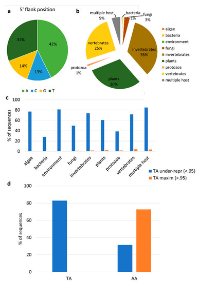 Analysis of virus editing. (a). Distribution of the flanking base of ADAR-compatible SNPs. (b). Host distribution of the 3872 viral genomes used as a training set. (c). Percentage of viral sequences (N = 3872) showing statistically significant TA under-representation (<0.05) and maximization (>0.95), divided per host class. (d). Percentage of TA and AA under-representation (<0.05) and maximization (>0.95), measured on the coding sequences of the nearly complete viral genomes reported in this paper.