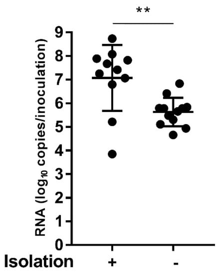 Comparison of RNA copy numbers of RV genomes between the 11 clinical specimens from which the viruses were successfully isolated and the 12 clinical specimens from which the viruses could not be isolated. Differences were analyzed by Welch’s unpaired t test. ** p < 0.01.