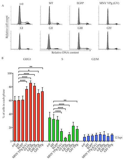 Conservation of a G0/G1 phase cell cycle arrest among norovirus genogroups. RAW-Blue cells were transfected with 4–5 µg of in vitro transcript RNA corresponding to enhanced green fluorescent protein (EGFP), murine norovirus (MNV) VPg, as well as genogroup (G) GI VPg, GII VPg, GIII VPg, or GIV VPg. Mock transfected (MT) cells were seeded at the time of transfection as a negative control. At 12 hours post-transfection (hpt), cells were harvested for fluorescence-activated cell sorting (FACS) analysis of the cell cycle. (A) Representative FACS histograms from one of three experiments. (B) The histograms were analysed using MODfit LT 3.0, and the percentage of cells in each phase of the cell cycle are shown. The results present the mean and SD from three independent experiments. Statistical significance was determined for comparisons between transfected cells and mock transfected cells, using a one-way ANOVA with Dunnett’s post-test. * p ≤ 0.05, ** p ≤ 0.01 and **** p ≤ 0.0001.